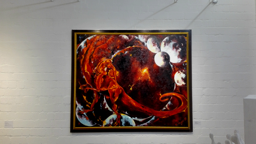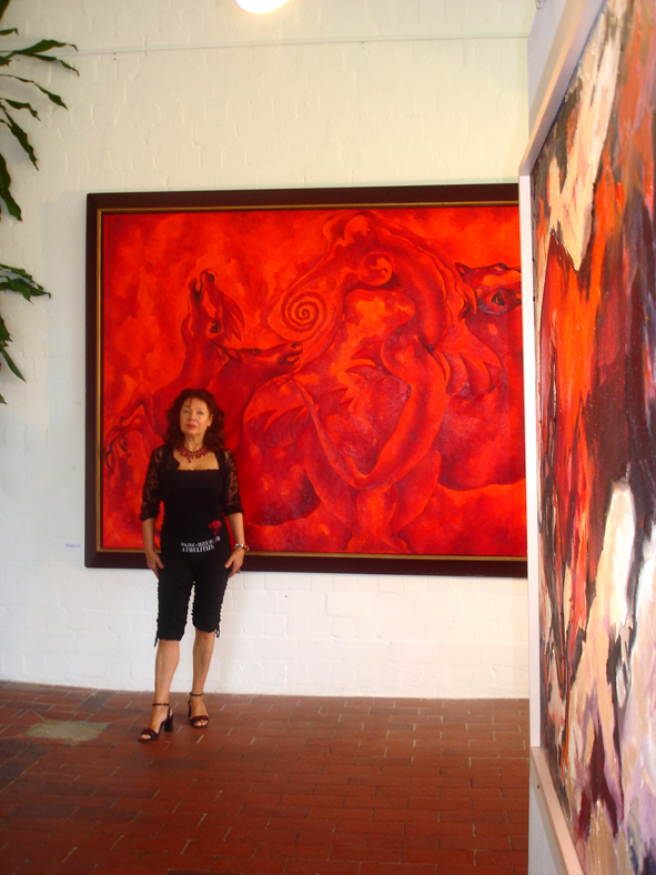 Die Künstlerin vor ihrem Kolossal-Gemälde (2 x 3